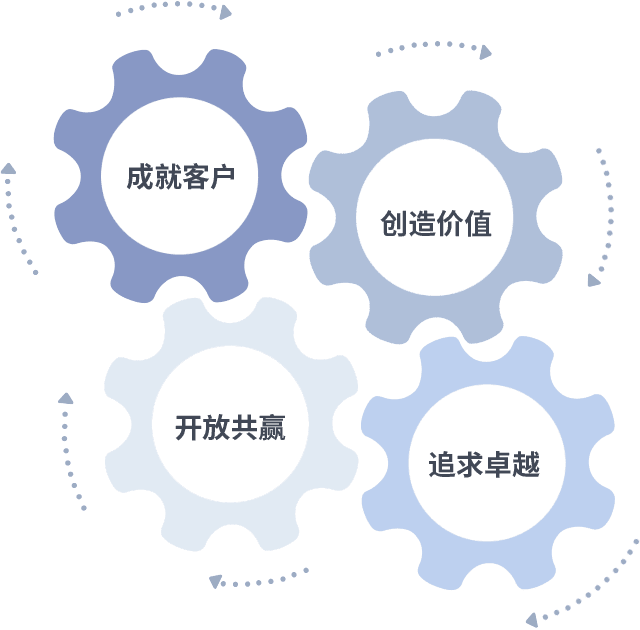 成就客户是一切决策的出发点,,创造价值是衡量所有工作的标准,,追求卓越是我们做事做人的态度,,开放共赢是我们的格局也是最终的结果。。价值观的齿轮环环相扣,,,推动着组织里的每个人不断向前。。。。