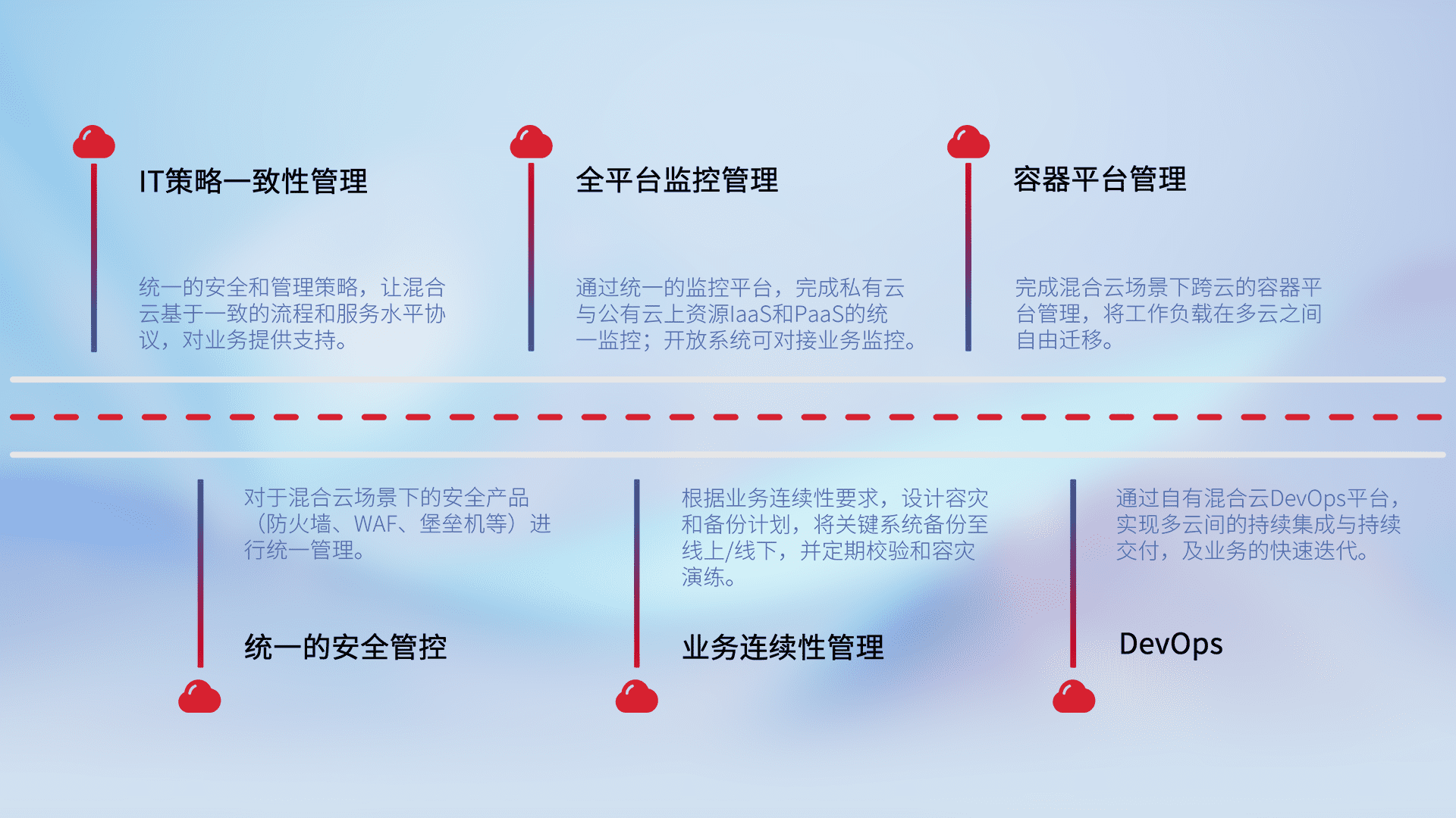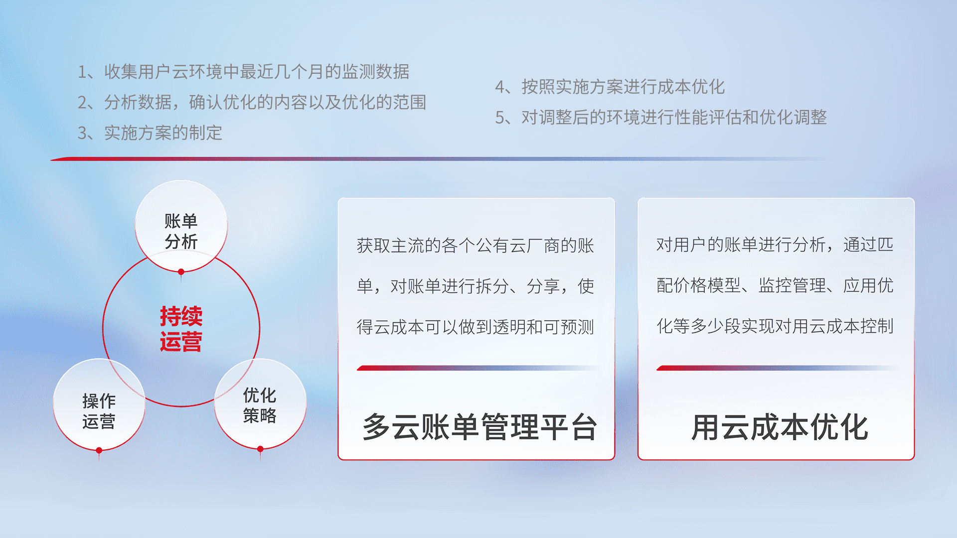通过多云纳管,,,,以统一的资源数据模型把客户的云资源进行抽象和封装,,,,进而实现对多云资源的统一操作,,,,保障云资源管理的可靠性、、、、稳定性与可用性。。量身定制化运维内容,,,,配置、、、开发运维、、补丁管理、、、、备份、、、监控、、、、认证和访问管理、、审计和日常巡检等,,,保障在用云过程中的可靠度,,稳定度以及高可用率。。。。