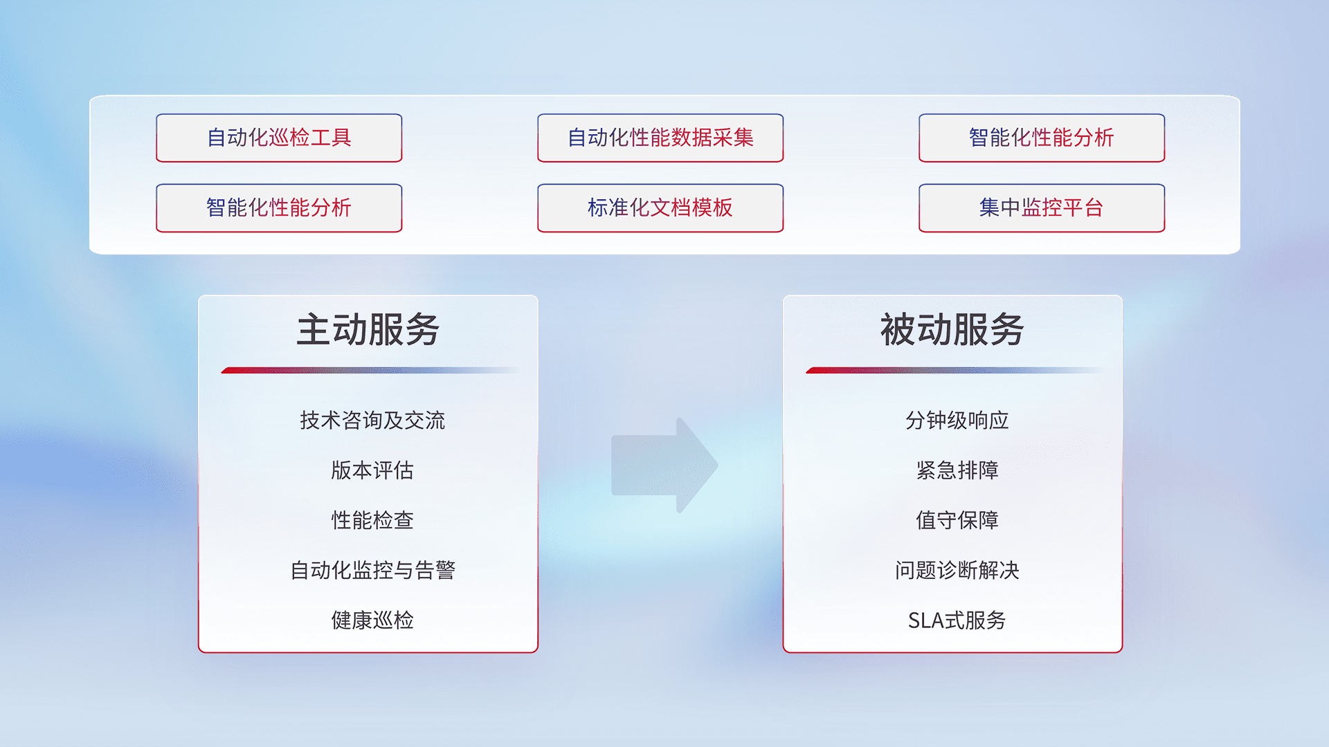智能化工具和标准化文档,,保障服务质量,,,,提供主动服务(包含技术咨询、、版本评估、、、、性能检查、、、、自动化监控与告警、、健康巡检)和被动服务包含(分钟级响应、、、、紧急排障、、值守保障、、、、问题诊断解决、、、SLA服务)。。。。