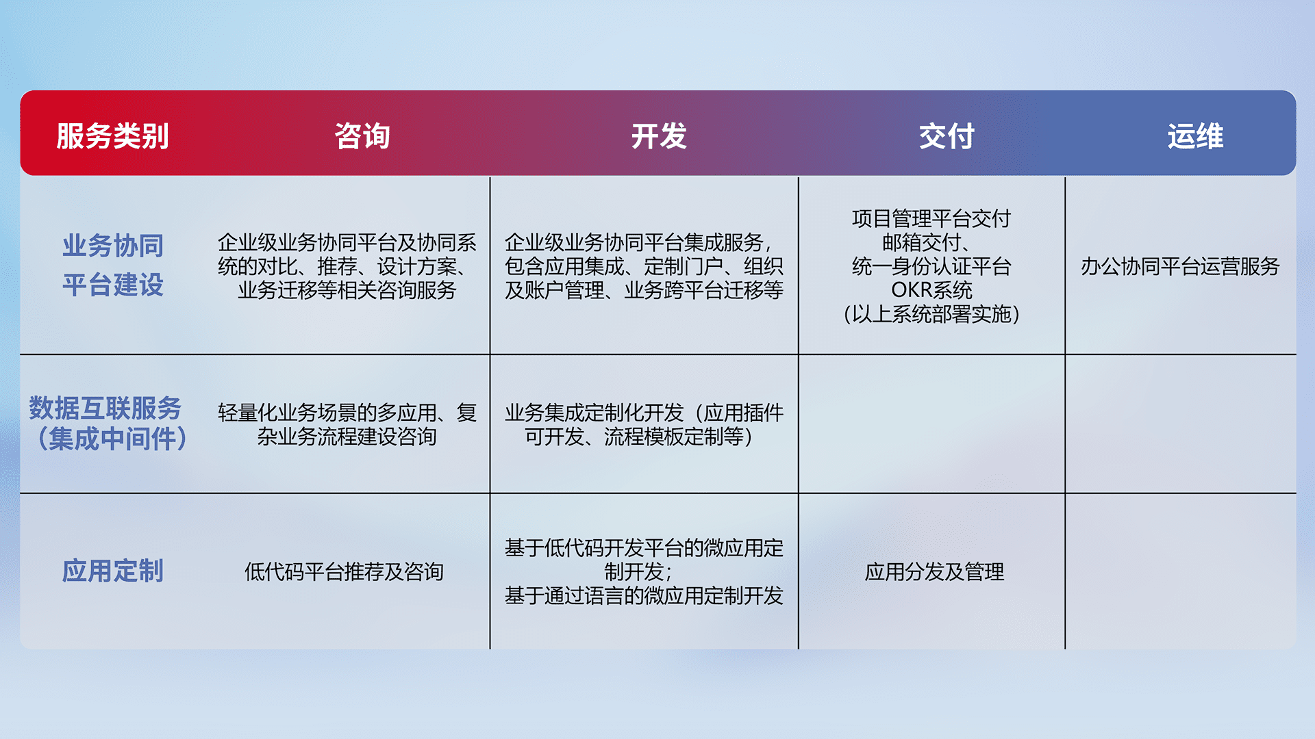 针对钉钉、、、、企微、、、IDaas等平台级产品提供产品的规划、、、方案、、、、交付、、、定制化开发等服务,,实现如统一协同办公、、智能客户服务、、、混合会议管理、、、智能数据查询、、、、等业务场景,,实现数字化转型。。。